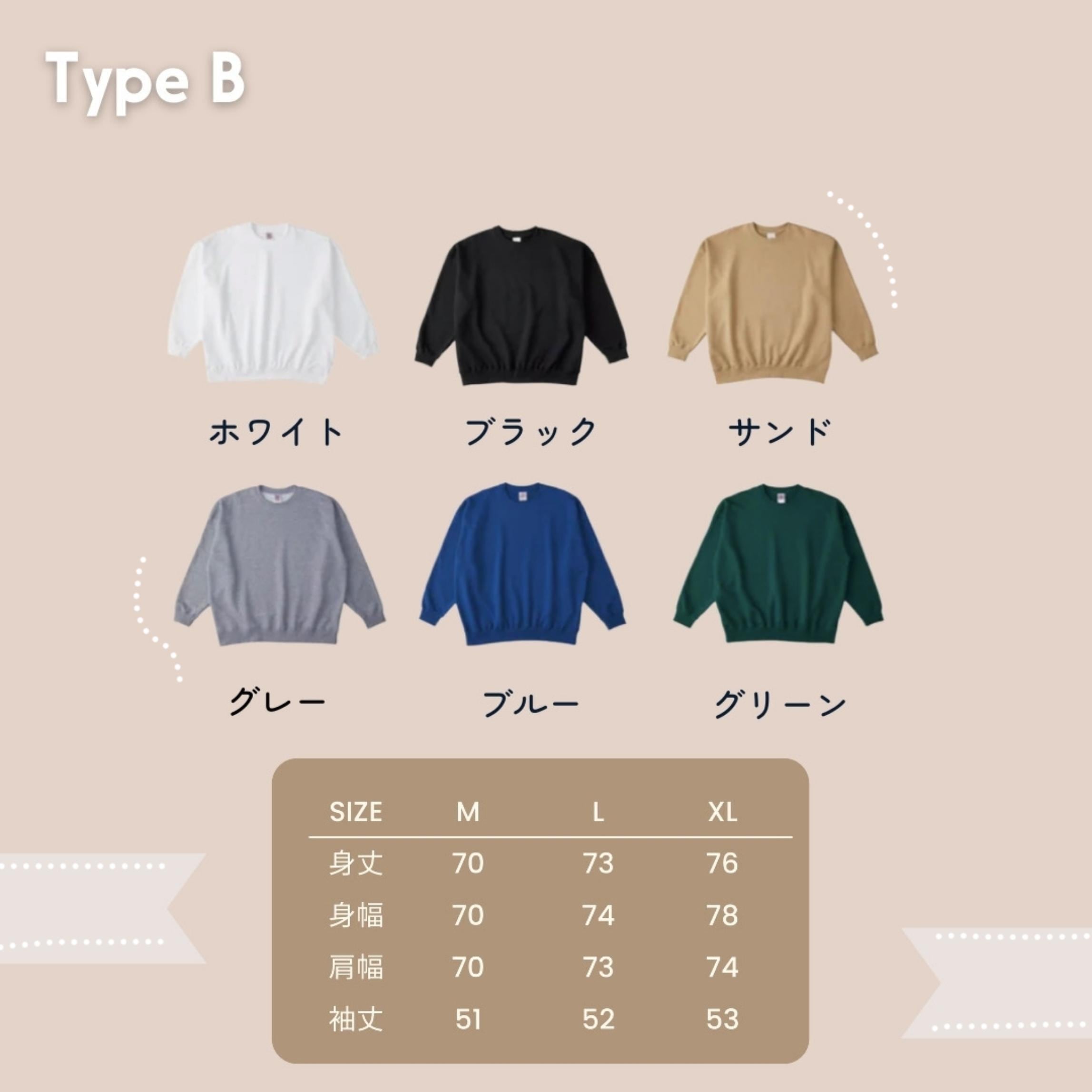 スウェットのタイプは【ベーシックタイプ】と【オーバサイズタイプ】+¥1500